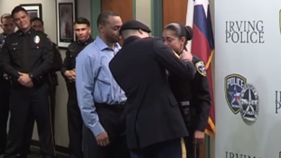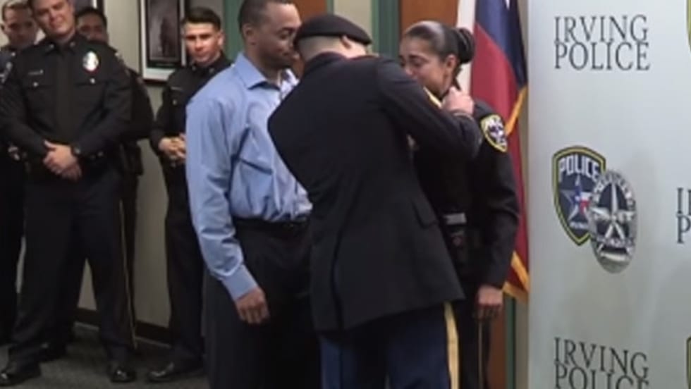 A newly minted officer with the Irving (TX) Police Department was stunned during her swearing in ceremony as her son—a member of the United States Army serving overseas—appeared at the facility to pin her star on her uniform.