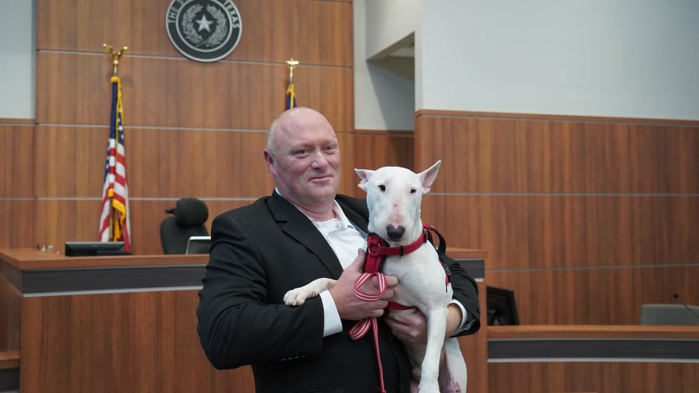 An officer with the Round Rock (TX) Police Department is now the proud owner of a three-year-old bull terrier that had suffered extensive injuries when it fell from the bed of a pickup truck and was dragged along the roadway for up to a mile before breaking free of its tether.