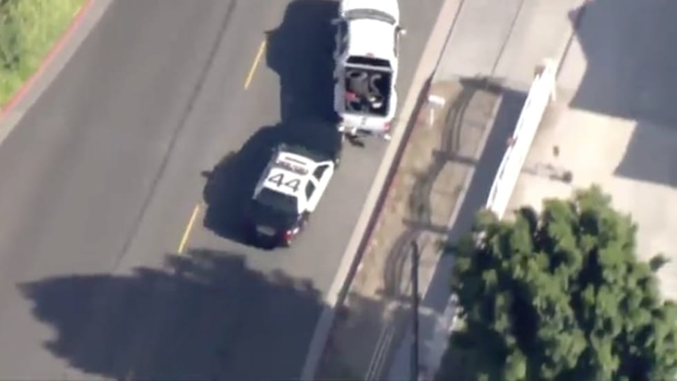 A suspected tire thief was arrested Thursday in Orange County, CA, after a wild high-speed police chase ended when officers used a PIT maneuver to spin out the truck and then had to chase the man down on foot into a front yard.