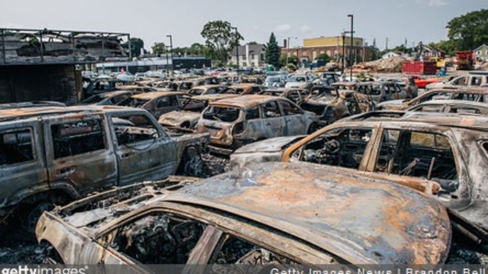 Damage in the downtown area of Kenosha was extensive. A car dealership and the vehicles on the lot were burned, businesses were looted, and even the public library was attacked.