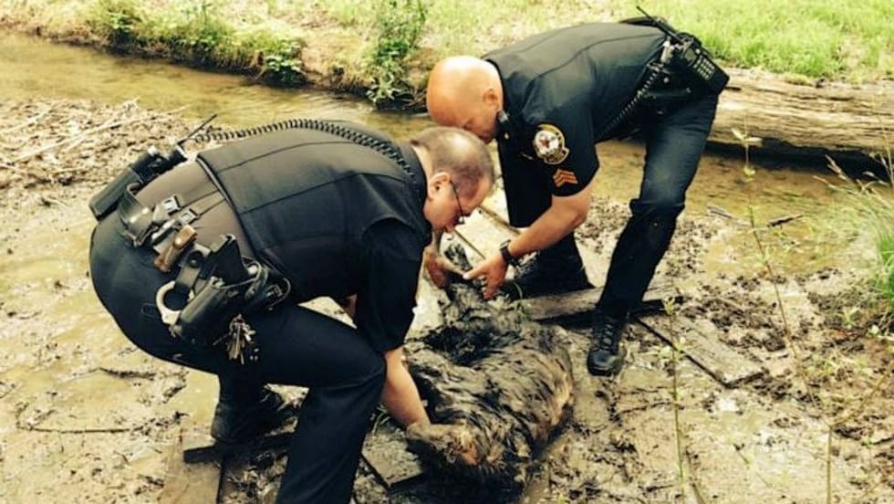 Photos: Willistown Township (Pa.) PD Facebook page. Photos posted on the Facebook page of the Willistown Township Police Department's Sergeant Mike Martin and Patrol Officer Mike Kushner rescuing a mud-trapped dog.