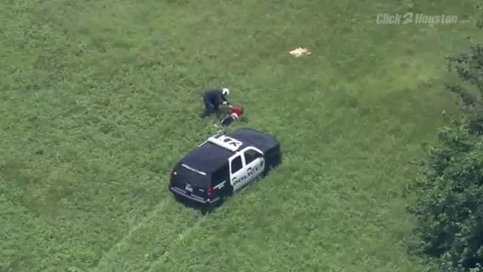 A chase ended with a Houston police helicopter crew member taking down a burglary suspect in north Houston right after he was run over by a police vehicle.