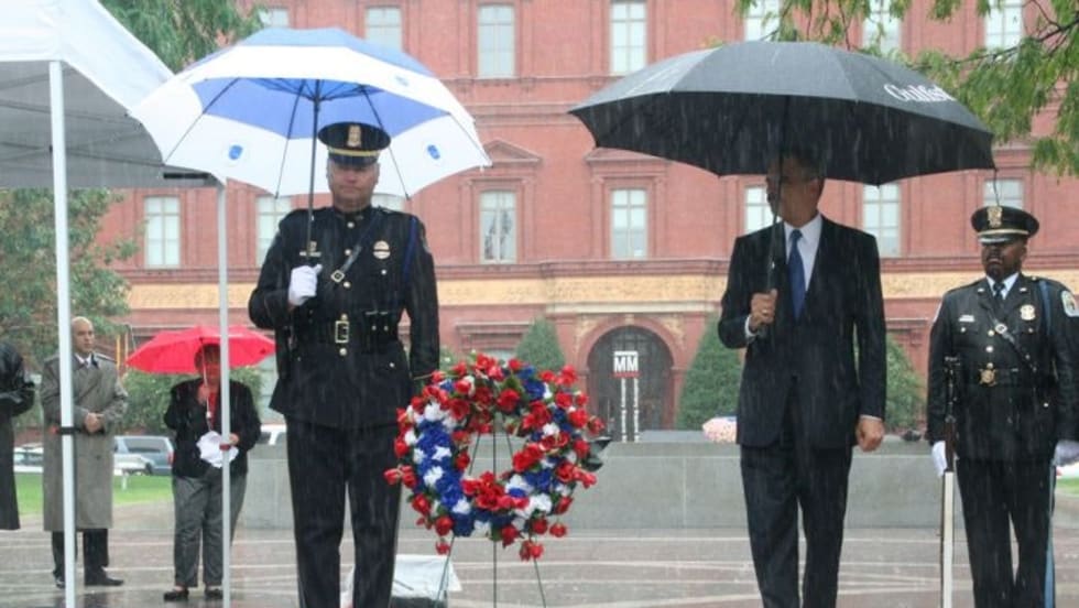 The rainy Friday observance, which was hosted by the National Law Enforcement Officers Memorial Fund (NLEOMF), honored the 10th anniversary of the deadliest day in American law enforcement history.