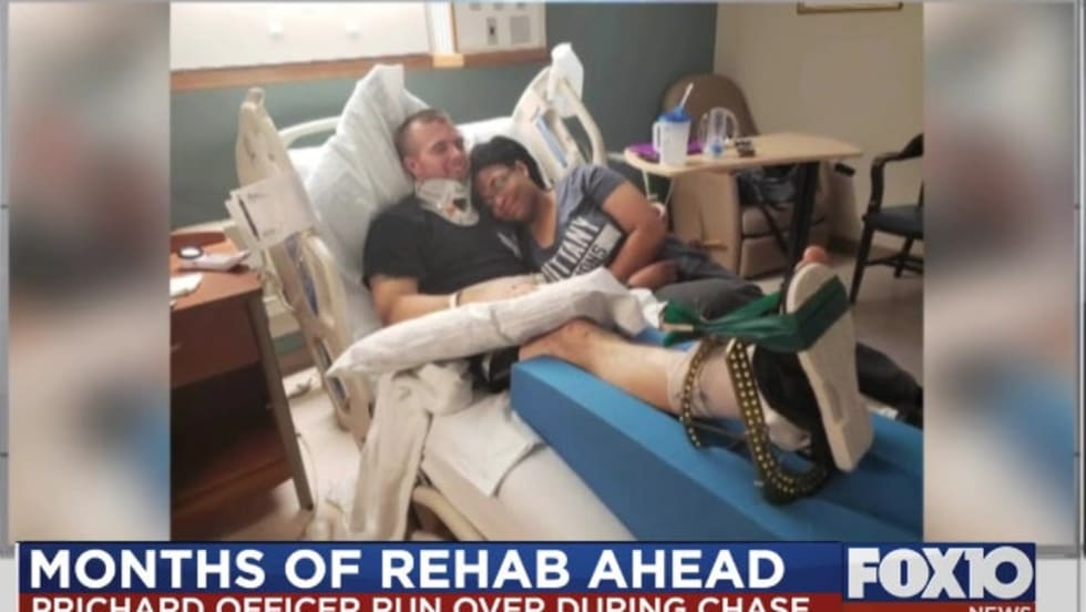 Officer Simeon Beeson has a fracture of the vertebrae near the base of his neck. In addition, "He had a few rib fractures, cracked ribs, crushed ankle...."