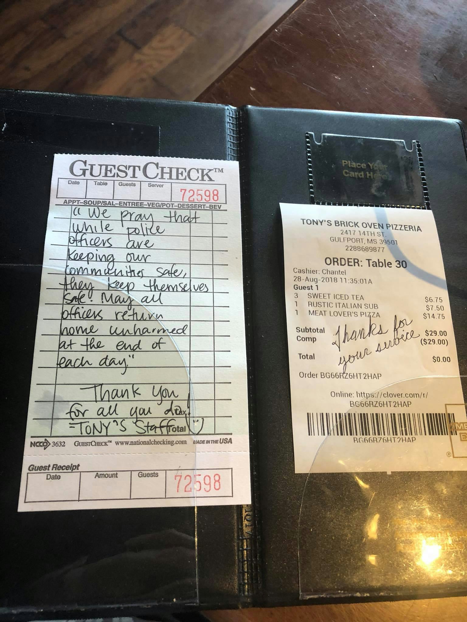 Read More →Sergeant Michael Burkett, Officer Jared McKinney, and Officer Brandon Zwick chose a Tony's Brick Oven Pizzeria in downtown Gulfport in part because it was so close to the PD where they were training.