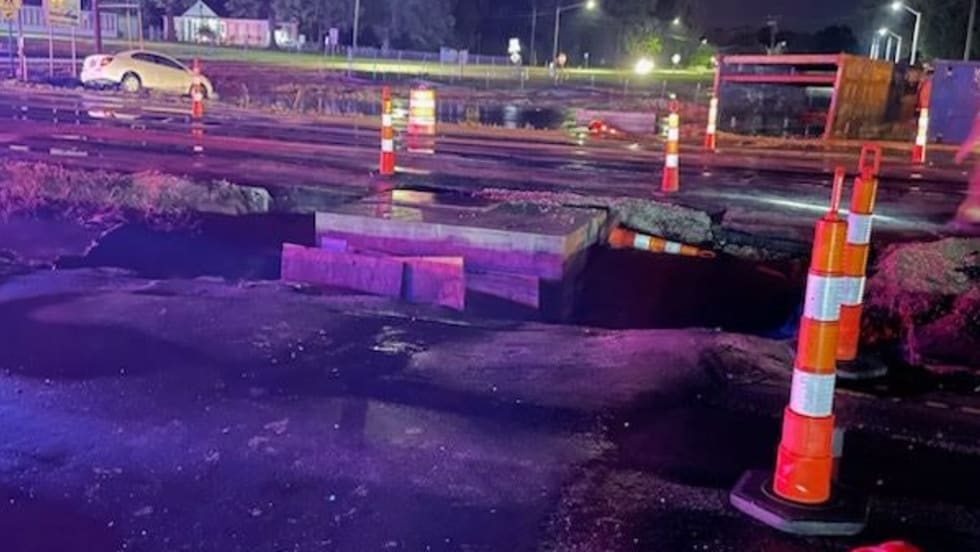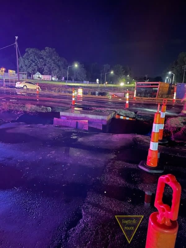 "When officers were attempting to close off the road ... there was a vehicle that was driving too fast for conditions and actually struck the officers' cars as they were out there and pushed the officer into the hole," Chief Kem Braden said.