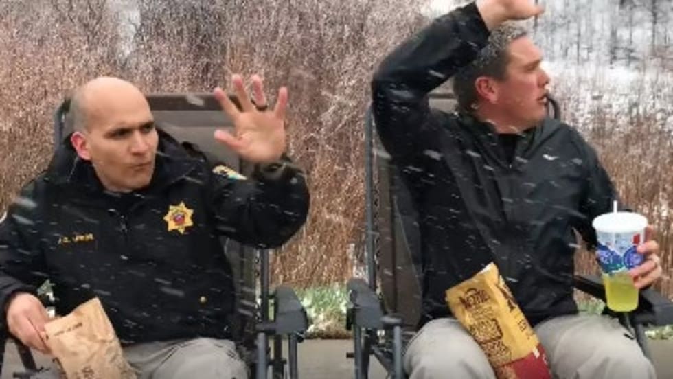 Two deputies with the Douglas County Sheriff's Office were seen in an amusing video sitting in lawn chairs and eating snacks beside the road of a freeway in their jurisdiction that tends to have foul-weather traffic collisions.