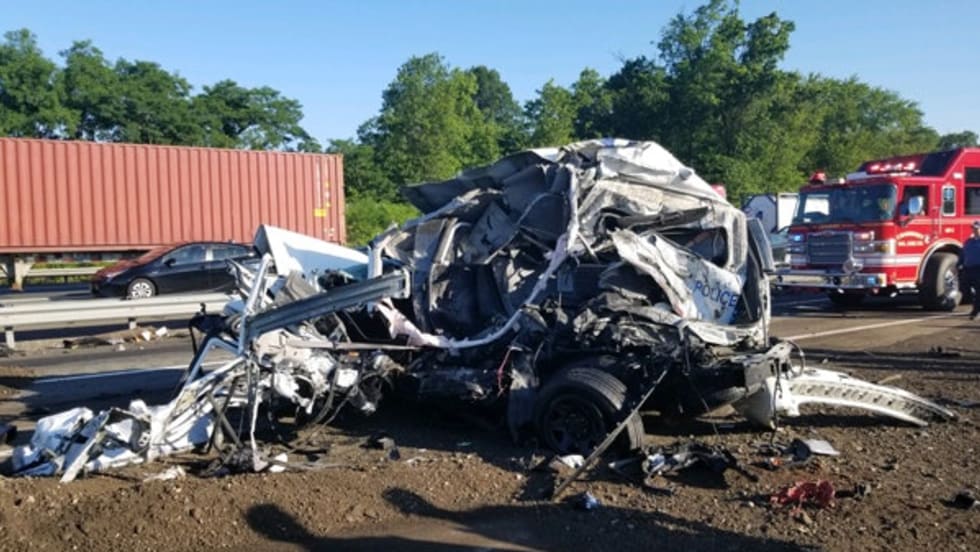 A trooper with the New Jersey State Police trooper was thrown 30 feet from his patrol vehicle in a vehicle collision with a dump truck Monday on the New Jersey Turnpike.