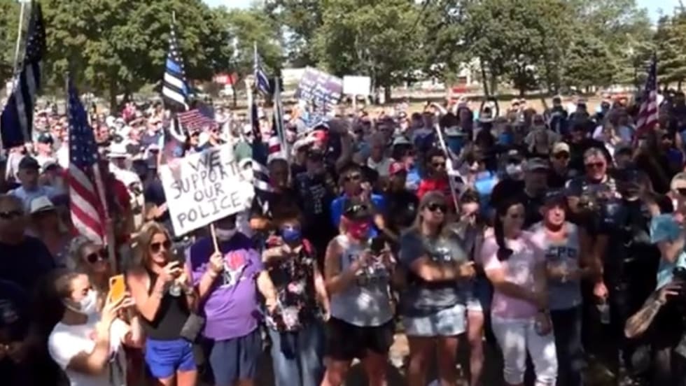 Hundreds of people held signs and banners in support of police officers during an event on New York's Long Island Monday.