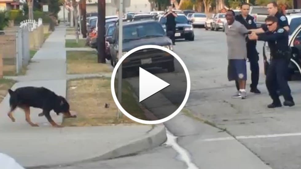 A Hawthorne (Calif.) Police officer shot and killed a man's Rottweiler after the dog lunged at a fellow officer who was arresting his master. The graphic incident was filmed by onlookers and posted to YouTube.