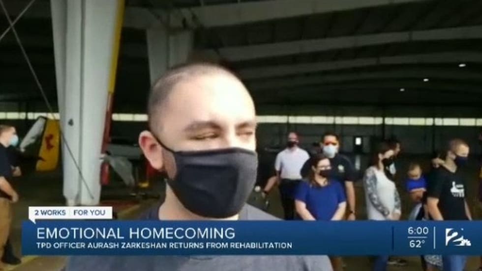 In a tweet, the Tulsa Police Department said Officer Aurash Zarkeshan is working on light duty. He recently came back home to Tulsa after he completed four months at a rehabilitation facility in Colorado