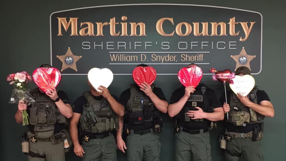 The Martin County (FL) Sheriff's Office posted an image on Facebook of five deputies collectively holding a bouquet of flowers, a heart-shaped balloon, and five boxes of Valentines chocolates, saying, "Our Warrants team is waiting for you with open cuffs. Don’t play hard to get, because they’re in it for the long haul and are truly committed to capturing your heart!"