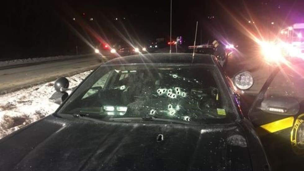 Trooper Conklin returned fire through his patrol vehicle's windshield — it was riddled with bullets from both firearms by the end of the exchange — and then Conklin got out of his vehicle after reloading his duty weapon.