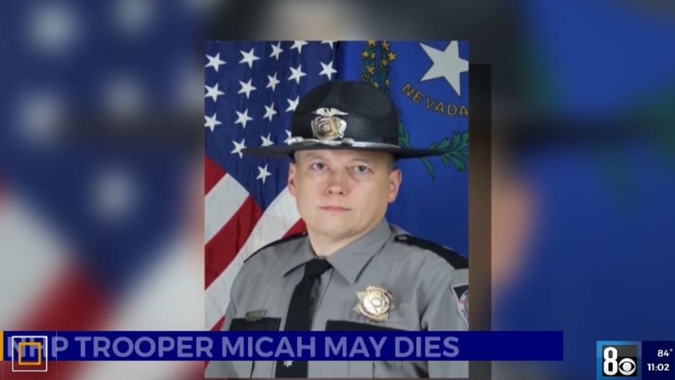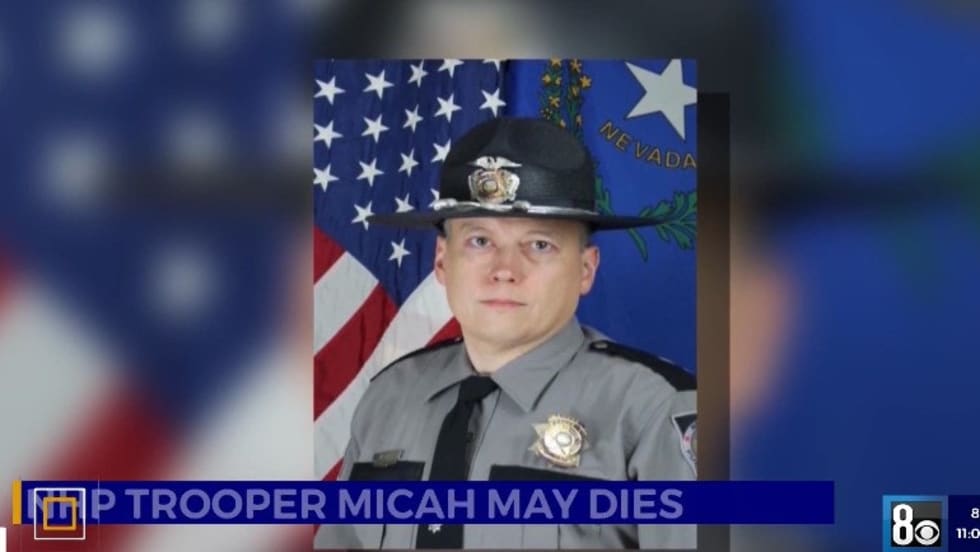 Trooper Micah May was hit by a car that was being chased on Interstate 15 in Las Vegas by other NHP troopers. The driver reportedly stole the car before leading officers on a chase that covered about 20 miles.