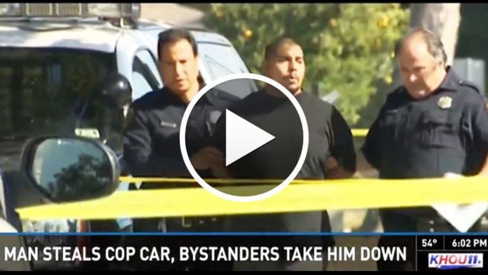 Several bystanders tackled a Houston man accused of stealing and crashing a patrol car and exchanging gunfire with police.