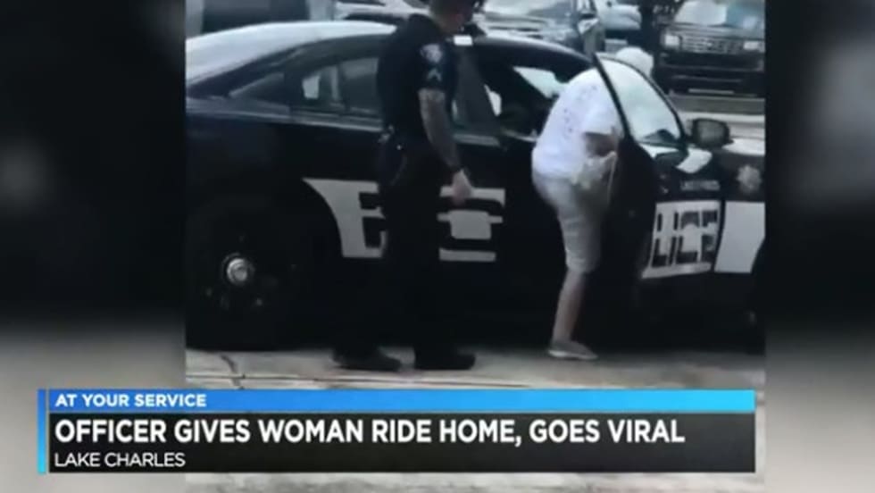 An officer with the Lake Charles Police Department was captured on cell phone video helping an elderly pedestrian into the passenger seat of his patrol vehicle and driving her home on a hot day.