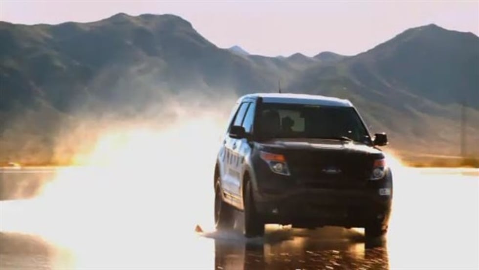 On a giant skid pad flooded with water, the officers push the limits of handling and control in a Ford Police Interceptor sedan and utility, Chevrolet Tahoe and Dodge Charger Pursuit. Source: Ford Motor Co.