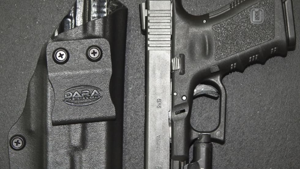 Dara's IWB Quick Ship Holster has a mid-ride height with a 7.5-degree forward cant angle and comes with a 1.5-inch handcrafted belt clip that will accommodate most gun belts.