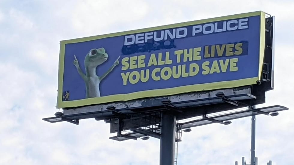 Monday night, an anti-police group called Indecline, who labels themselves a guerrilla activist art collective altered two Geico ads on the Interstate.