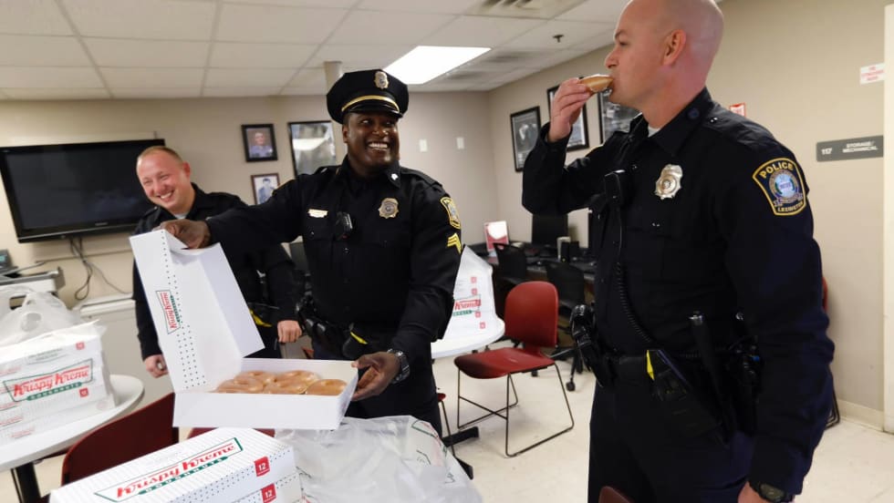 When a social media post by the Lexington (KY) Police Department—showing officers appearing to be crying after fire destroyed a Krispy Kreme Doughnuts delivery truck—went viral, the confectioner company sent a message via twitter to the agency saying that more doughnuts are "on the way." On Wednesday, the company delivered on its promise.