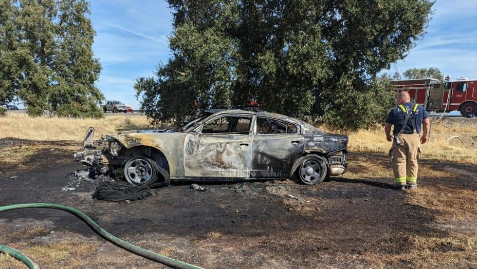 The suspect reportedly drove off in the CHP patrol vehicle and crashed into a semi truck, causing both vehicles to plunge down an embankment. The patrol vehicle burned.