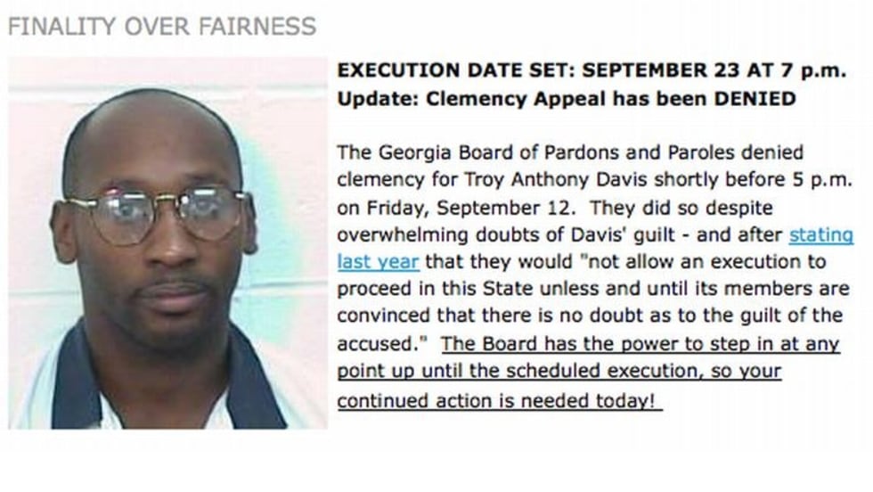 Read More →Georgia's Board of Pardons and Paroles is now meeting to determine whether to grant clemency to Troy Anthony Davis or allow his execution set for Wednesday to go forward as planned. Davis sits on death row for the 1989 murder of an off-duty Savannah police officer, Mark Allen MacPhail.