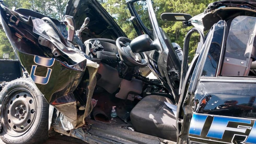 A deputy with the Chester County (SC) Sheriff's Office was injured when a tree truck crashed into his patrol vehicle at an intersection on Saturday morning.