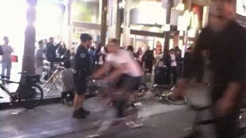 Part of the incident was captured on a hand-held camera and posted as "Hollywood Cops Attack Bicycle Riders." The clip shows one officer kicking a protester, and does not clearly show the incident.
