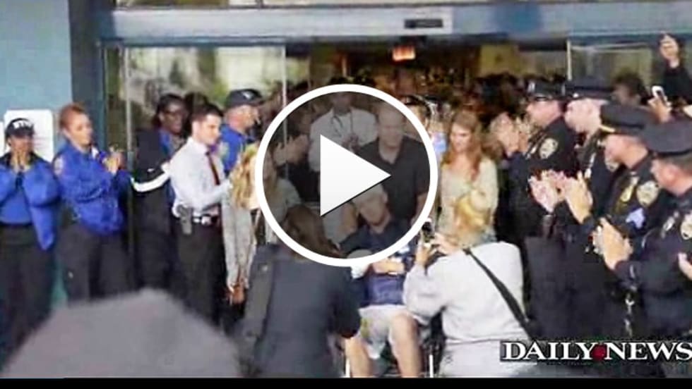 Officer Kenneth Healey, his head and right arm bandaged, was wheeled out of Jamaica Hospital about 3:30 p.m. as 200 uniformed officers clapped and cheered and members of a police bagpipe band played Irish tunes.