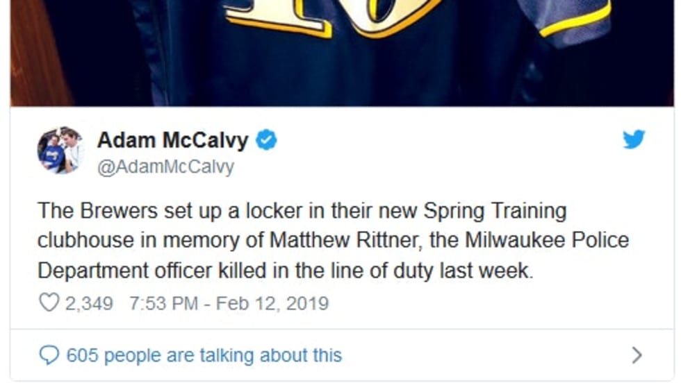 The Milwaukee Brewers have set up a locker in their Spring Training clubhouse dedicated to Officer Matthew Rittner, who was killed in the line of duty as he executed a narcotics and firearms related search warrant.