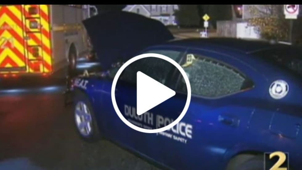 Two Duluth (Ga.) Police officers exchanged fire with a man and woman who attempted to rob a massage parlor, dodging a hail of rounds that struck a police cruiser.