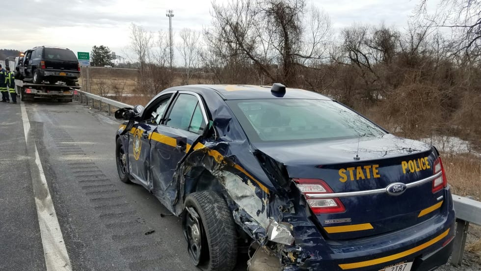 A trooper with the New York State Police suffered minor injuries when a tractor trailer truck struck his vehicle as he was assisting a disabled vehicle.