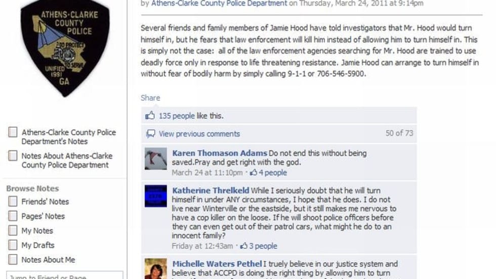 Police agencies and a former University of Georgia football player posted messages for Jamie Hood and contacted him via Facebook, underlining the growing role of social media sites serving law enforcement.