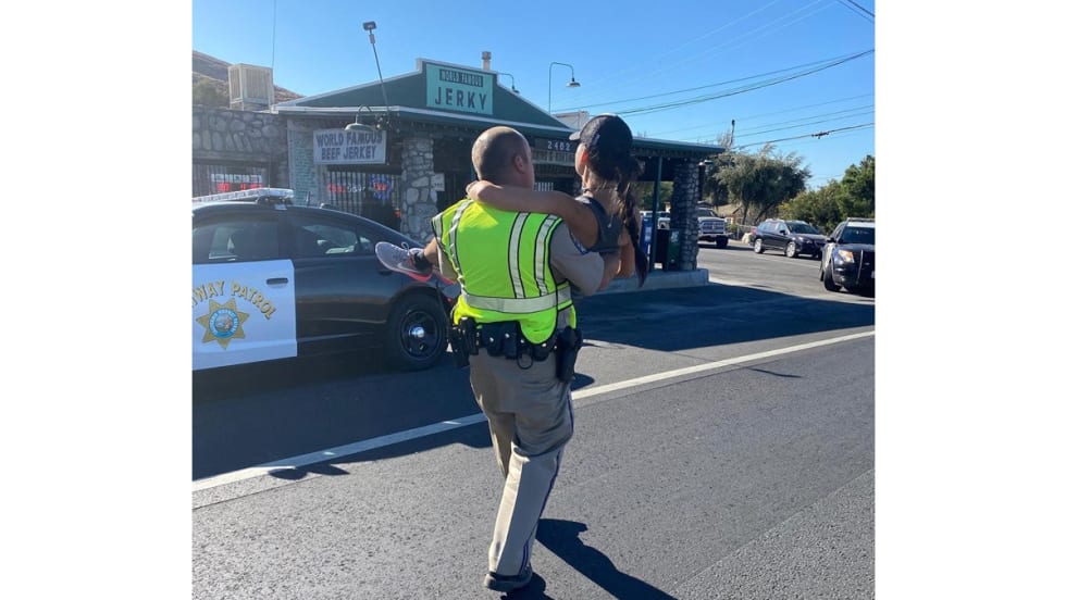 An officer with the California Highway Patrol came to the aid of a runner who suffered a stress fracture in her leg during a marathon / half-marathon event over the weekend in the forested area of Big Bear in the mountains just east of Los Angeles.
