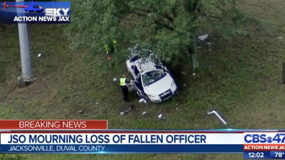 Sheriff Mike Williams said the officer was responding to a traffic crash on rain-slicked I-295 at 4:30 a.m., when the officer hit a tree.