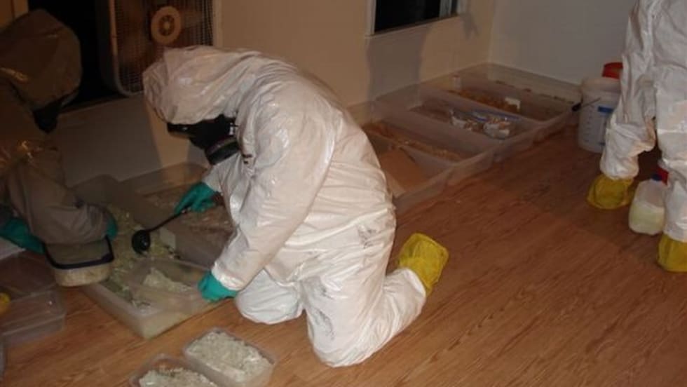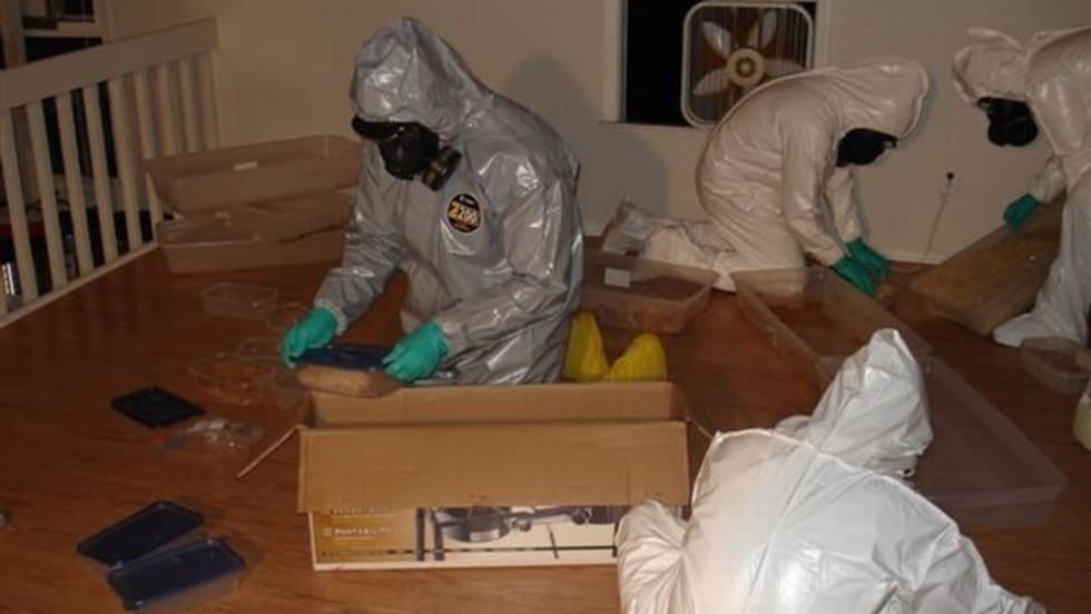 The Atlanta Field Division of the DEA sent its Clandestine Laboratory Enforcement Team in white "bunny suits" to collect evidence at the site prior to clean up.
