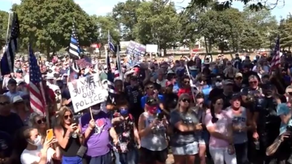 Hundreds of people held signs and banners in support of police officers during an event on New York's Long Island Monday.