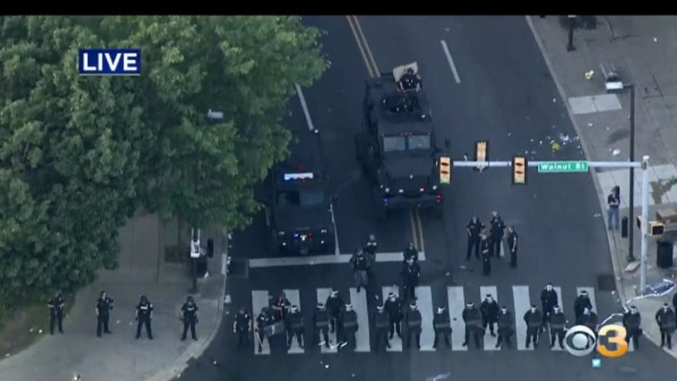 Officers with the Philadelphia Police Department were hit with bricks and Molotov cocktails in West Philadelphia Sunday as peaceful protesting turned into violent rioting over the weekend.