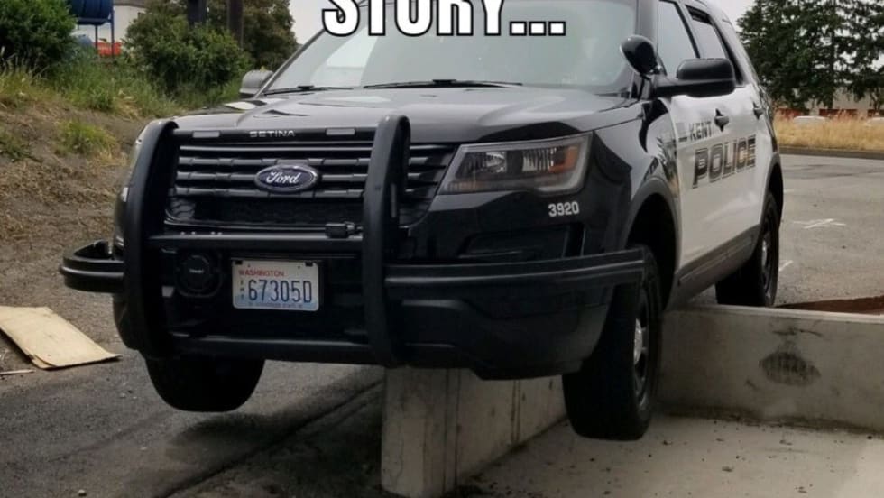 A rookie officer with the Kent (WA) Police Department somehow managed to put his squad car on a large curb—perhaps a foot or more in height—and the department had some fun with the incident on Twitter.