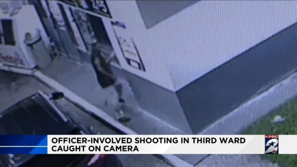 Surveillance camera footage shows the officer shooting at an armed man at a gas station convenience store on Saturday night—the gun then flies from the suspect's hand.