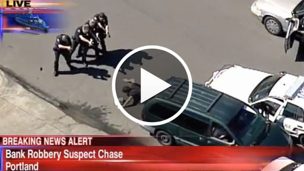 Portland Police Bureau officers credited a local television news helicopter with helping them apprehend a bank robbery suspect, after officers had broken off a high-speed pursuit.