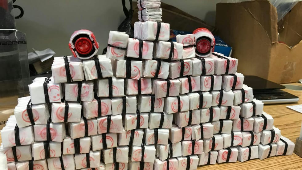 The agency posted a picture of the haul on Facebook, with the caption, "Who's smiling now? It sure isn't the 11 drug dealers who were peddling heroin in Mount Vernon and environs with a red smiley face stamped on their envelopes."