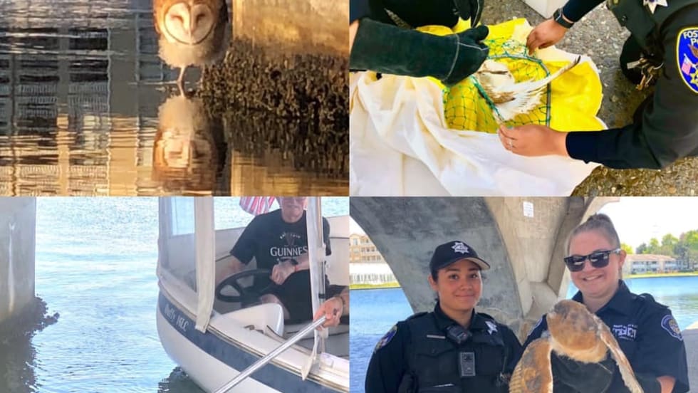Two officers with the Foster City Police Department took quick action to rescue an injured barn own from beneath a Bay Area bridge on Monday.
