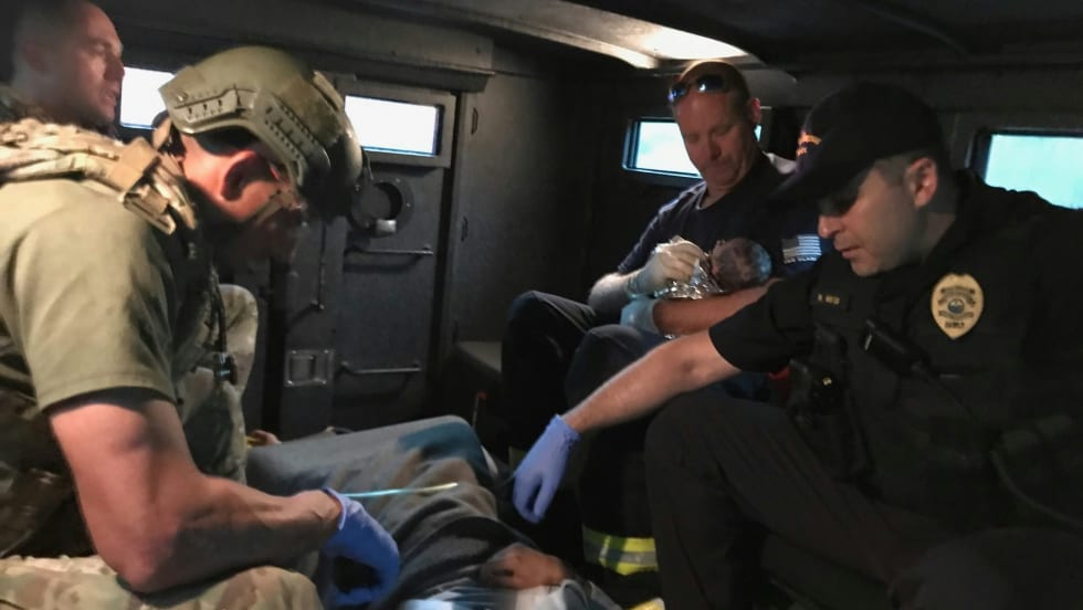 A family in Coral Springs, FL, called 911 when the soon-to-be mother went into labor during Hurricane Irma. Police and fire crews took a BearCat armored vehicle through the city to reach them.