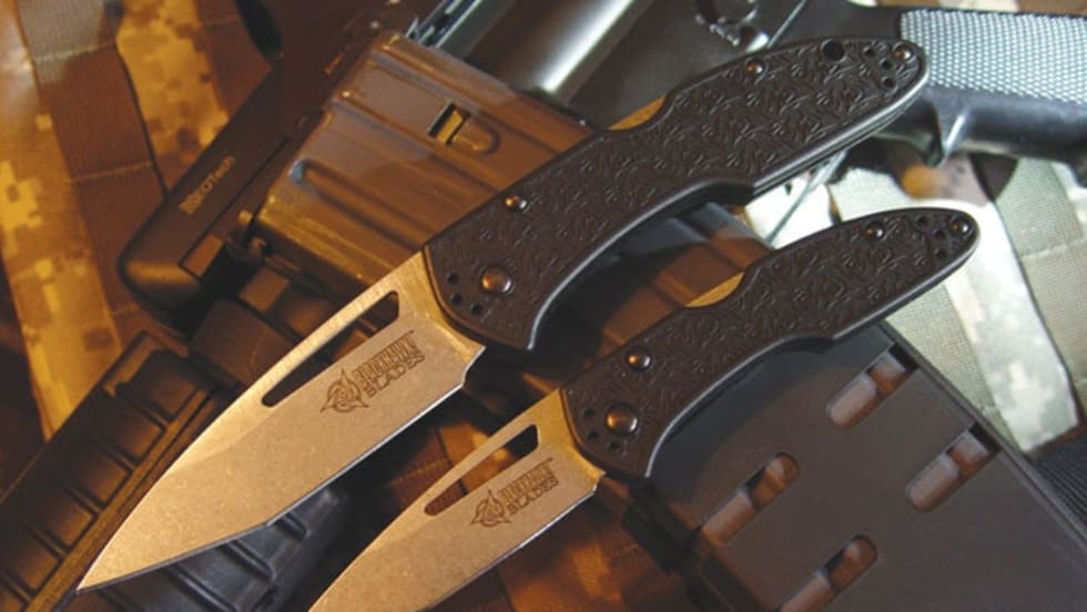 BlackHawk Blades’ BHB40 and BHB41 knives are both built on a framework of 420J stainless steel liners and fiberglass-reinforced-nylon handle overlays. Both drop-point tanto blades are ground from 9Cr13CoMoV stainless steel and feature a slotted hole for one-handed opening.