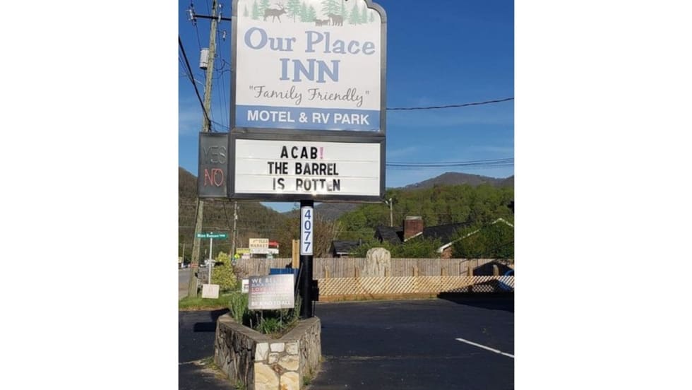 The message: “ACAB! The Barrel is Rotten” was posted days ago on a sign in front of the Our Place Inn, and later shared on its Facebook page.