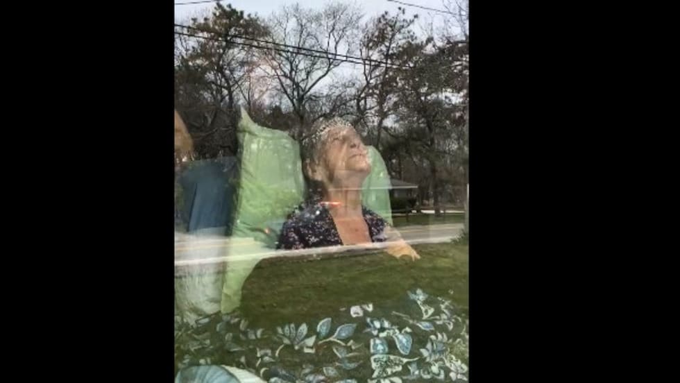 Video of the emotional response by an elderly woman to the kind act of firefighters' and police officers' "drive-by parade" has gone viral on social media.