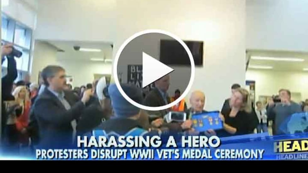 100-year-old U.S. Navy vet Dario Raschio was supposed to be presented with medals by Sen. Ron Wyden (D-OR), but soon after the meeting began, more than 100 protesters emerged, shouting "hands-up, don't shoot!" and "I can't breathe!"