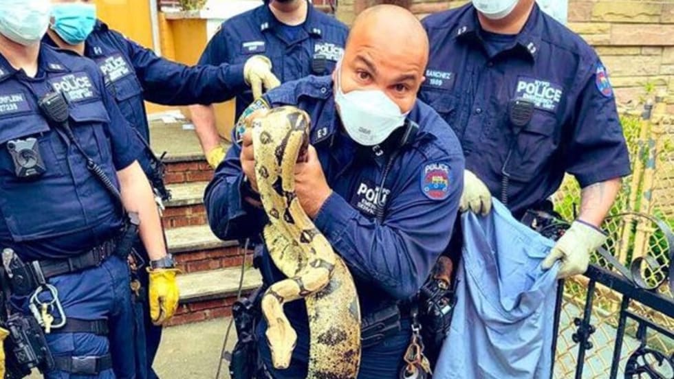 An officer with the New York Police Department who keeps snakes as pets used his experience to capture an eight-foot boa constrictor that was wrapped around a light fixture on Friday morning.