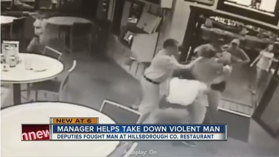The Hillsborough County (FL) Sheriff's Office is praising the actions of a manager at a local Hooters restaurant for jumping in to help two deputies who were attacked by an unruly customer.